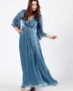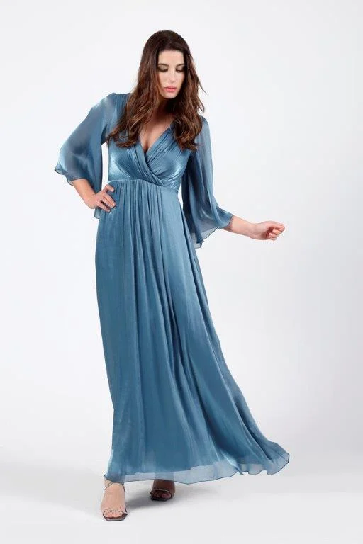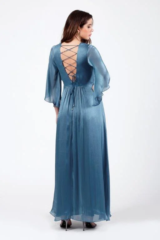 Κομψό maxi φόρεμα σε Α-γραμμή που χαρίζει αέρινη και θηλυκή κίνηση. Διαθέτει ντεκολτέ σε σχήμα V με διακριτικά μανίκια,και δέσιμο στην πλάτη. Ιδανική επιλογή για επίσημες εμφανίσεις, γάμους και βραδινές εξόδους.