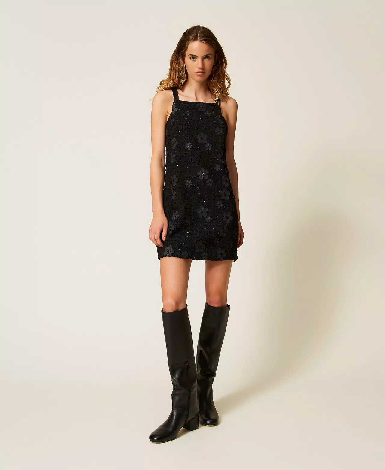 Κοντό φόρεμα μπουκλέ με τρισδιάστατο κέντημα λουλουδιών. Αμάνικο με φαρδιές τιράντες και τετράγωνο γιακά, κρυφό φερμουάρ στην πλάτη, φόδρα, ίσια εφαρμογή.